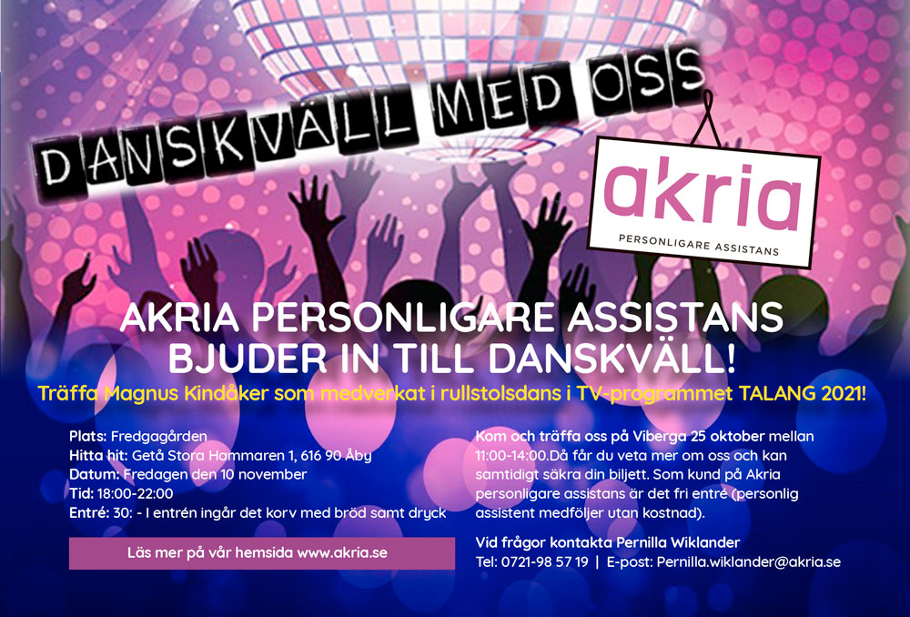 Välkommen Du som redan är kund hos oss på Akria Personligare assistans, Du som vill bli kund eller Du som har en funktionsnedsättning och upplever att Du också vill dansa med oss eller bara vara tillsammans och ha en fin kväll. Du som personlig assistent hälsas givetvis också hjärtligt välkommen!